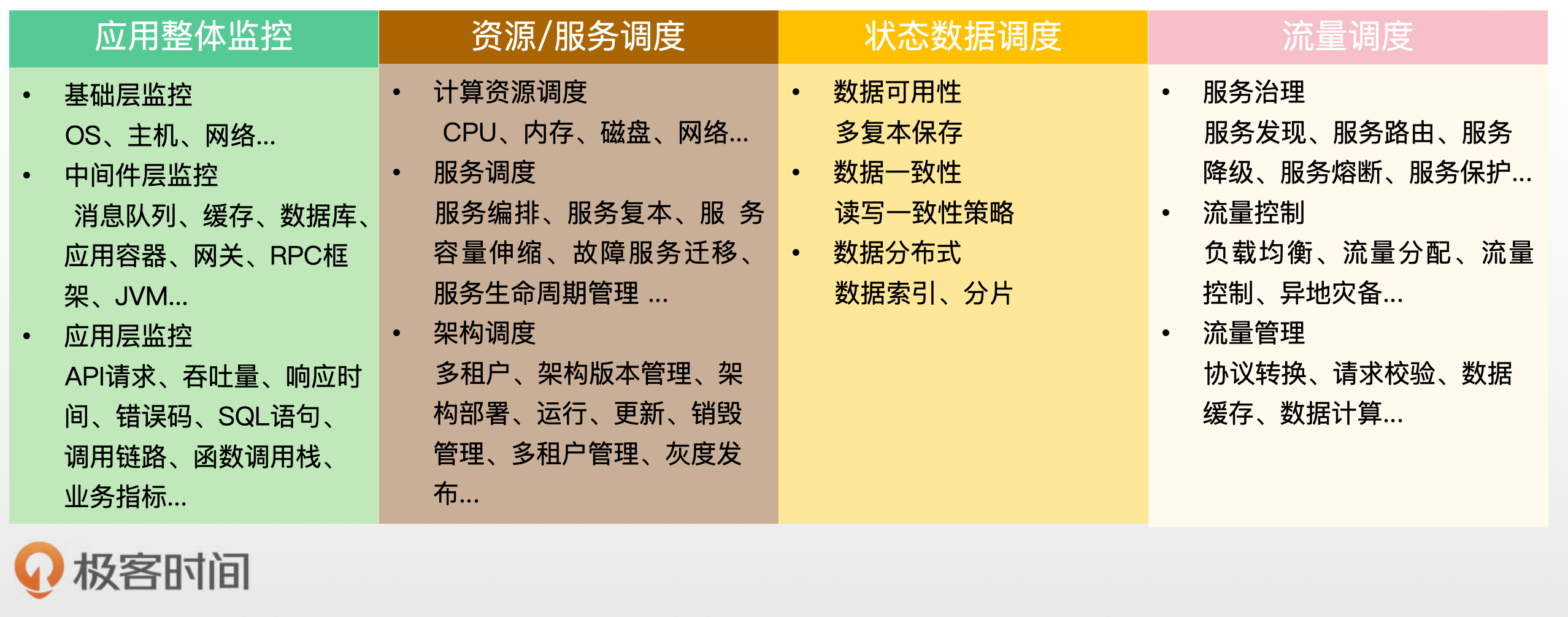 • 服务治理。服务拆分、服务调用、服务发现、服务依赖、服务的关键度定义……服务治理的最大意义是需要把服务间的依赖关系、服务调用链,以及关键的服务给梳理出来,并对这些服务进行性能和可用性方面的管理。