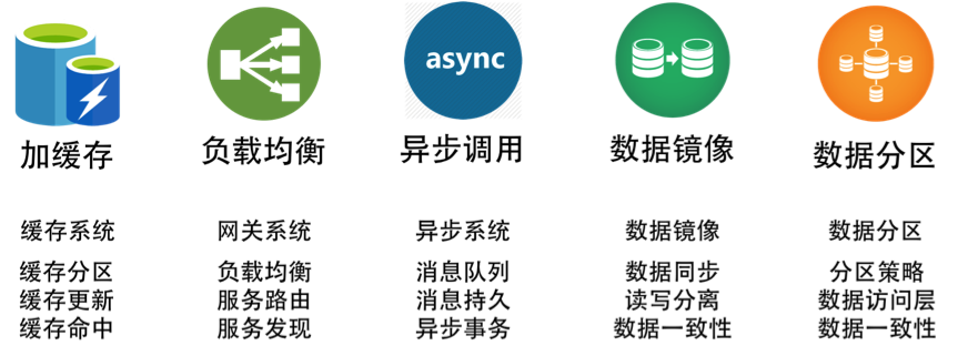 • 限流降级。当系统实在扛不住压力时,只能通过限流或者功能降级的方式来停掉一部分服务,或是拒绝一部分用户,以确保整个架构不会挂掉。这些技术属于保护措施。