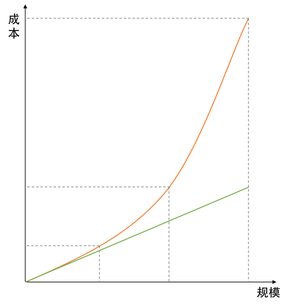 在这个图中,我们可以看到,当需要处理的数据或是用户请求的规模越来越大时,我们的成本是呈现快速上升的曲线,而不是一个线性上升的成本关系。