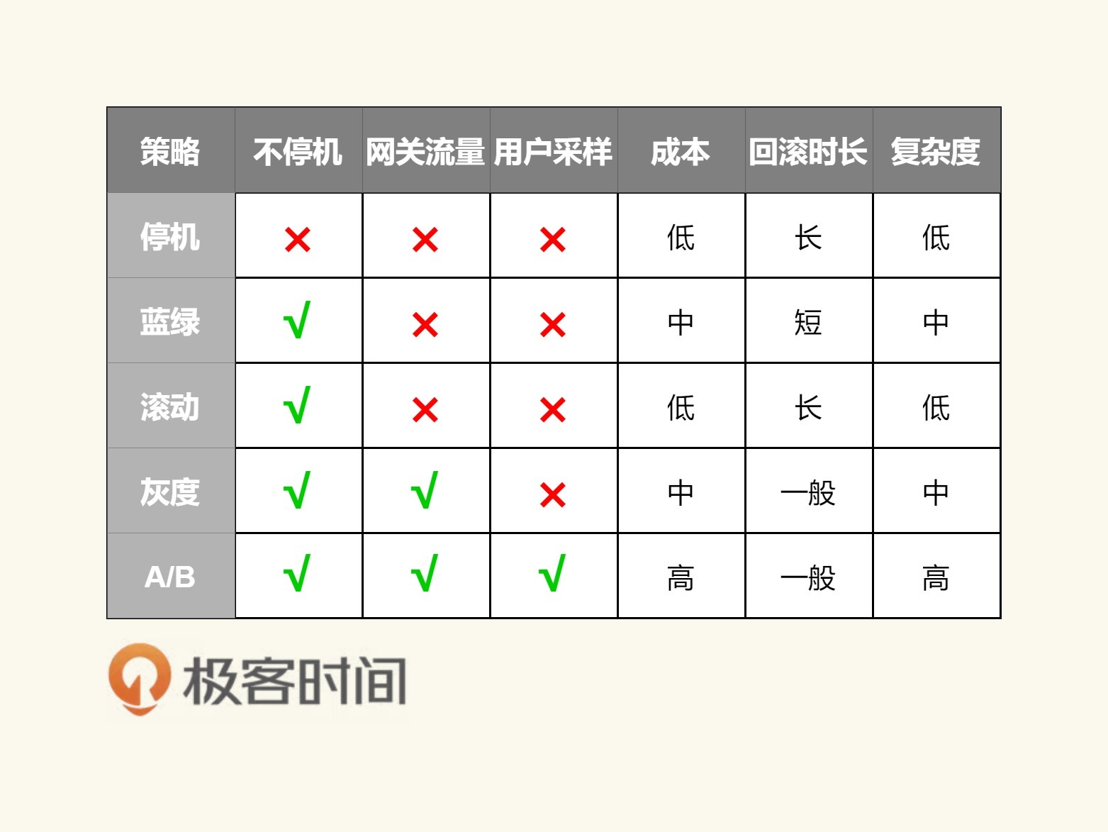 好了,我们来总结一下今天分享的主要内容。首先,常见的部署升级策略有停机、蓝绿、滚动、灰度和AB测试这几种。然后,我讲述了每一种部署策略的含义和优缺点。最后,我将它们放在一起做了一个比较。下一讲是《分布式系统设计模式》第三部分——性能设计的第一篇"缓存"。希望对你有帮助。