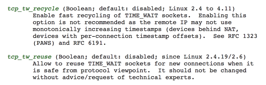 还有,很多中国的文档都会教人把tcp_tw_recycle和tcp_tw_resue这两个参数打开。然而,只要你man 一下 TCP(7) ,就可以看到这样的描述: