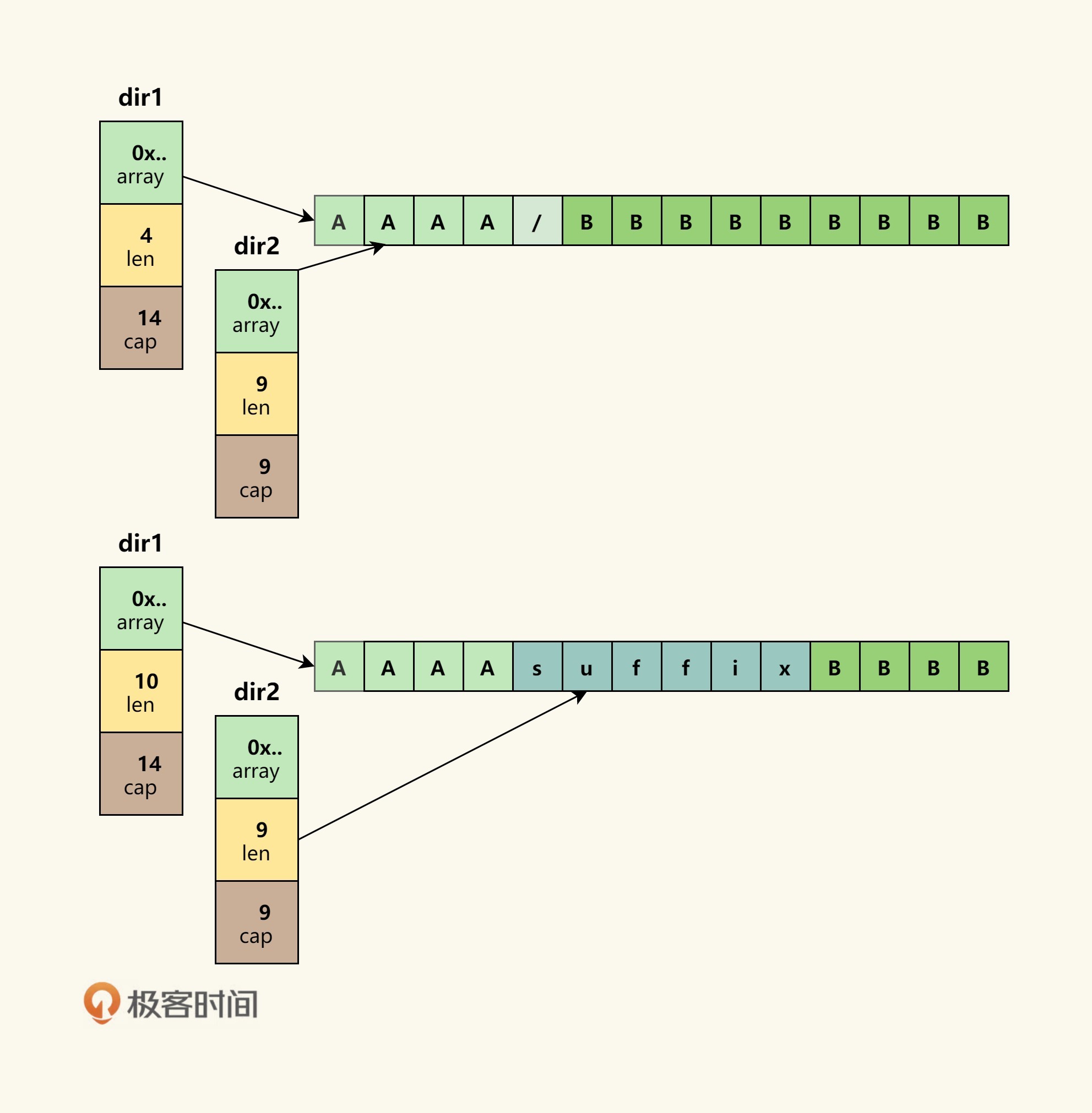 在这个例子中, dir1dir2 共享内存,虽然 dir1 有一个 append() 操作,但是因为 cap 足够,于是数据扩展到了 dir2 的空间。下面是相关的图示(注意上图中 dir1dir2 结构体中的 caplen 的变化):