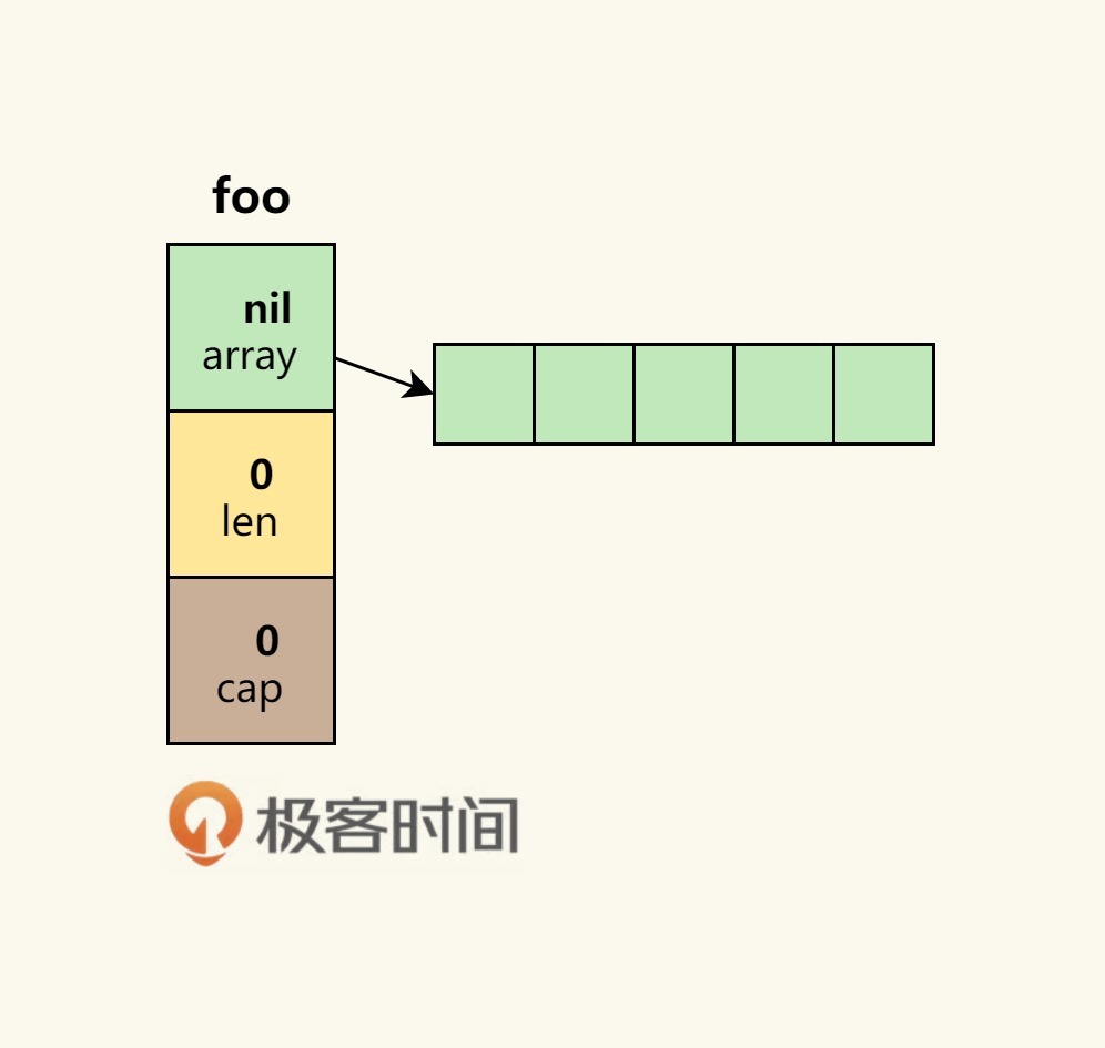 • 首先,创建一个 foo 的 Slice,其中的长度和容量都是 5;
