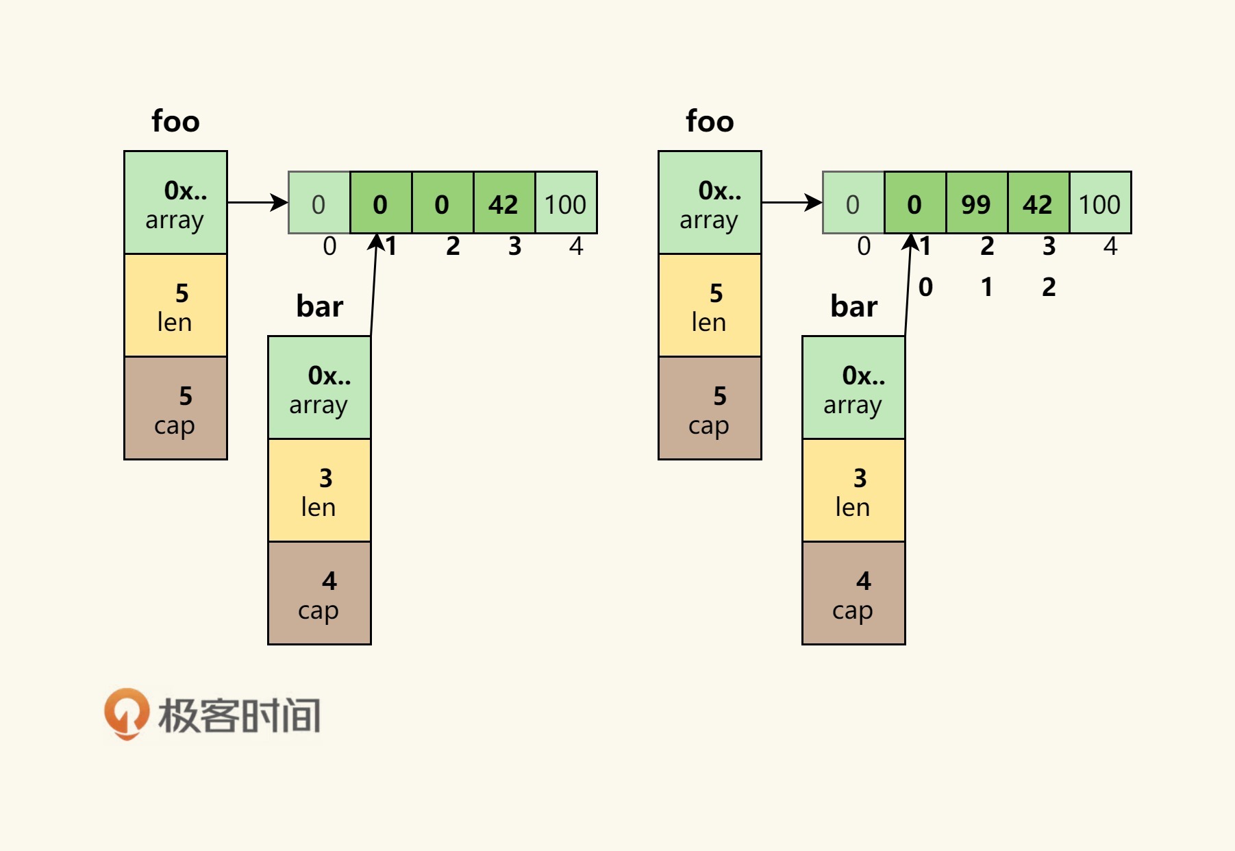 • 最后,对 foo 做切片后赋值给 bar,再修改 bar[1]。