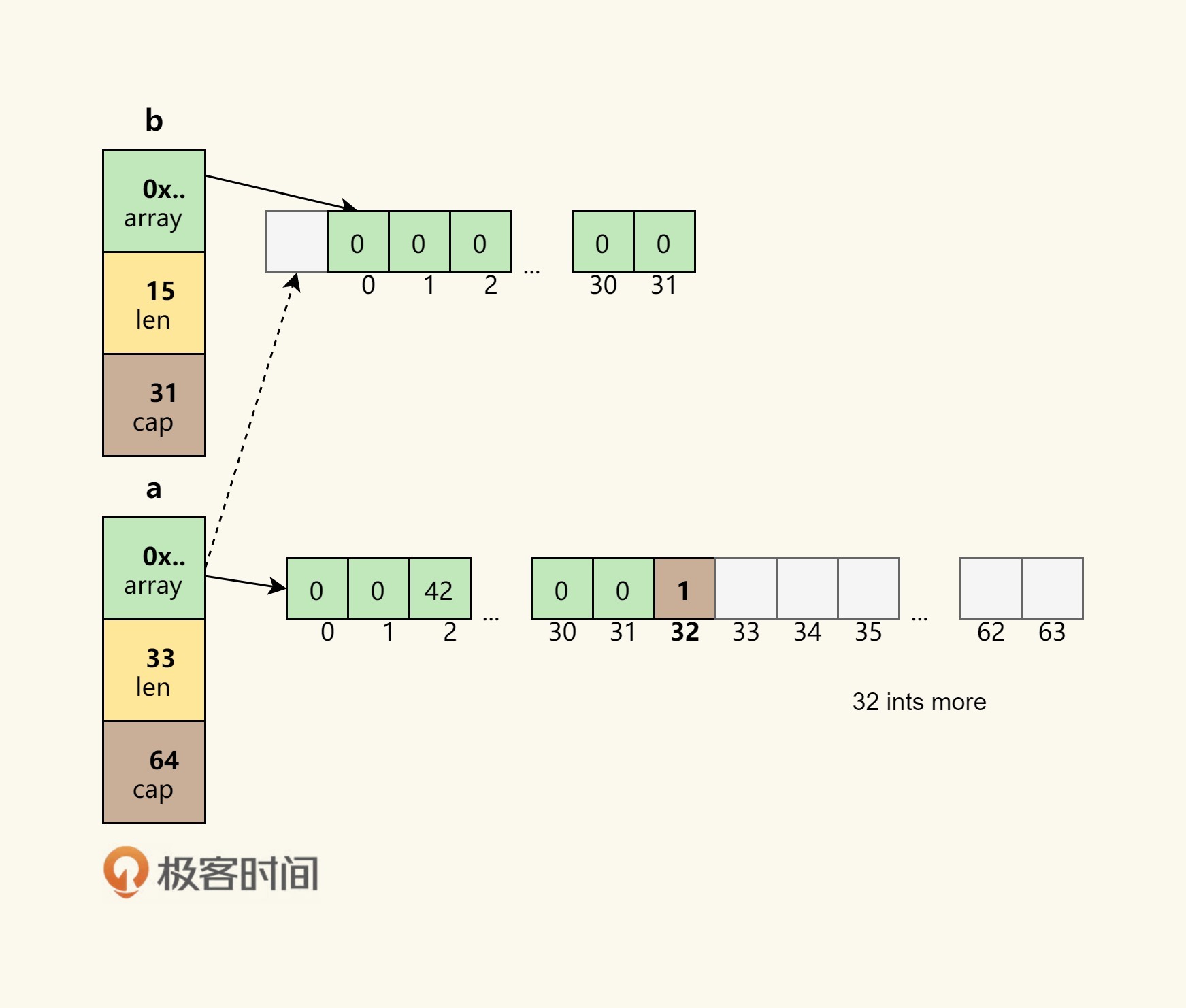 从图中,我们可以看到, append() 操作让 a 的容量变成了 64,而长度是 33。这里你需要重点注意一下, append() 这个函数在 cap 不够用的时候,就会重新分配内存以扩大容量,如果够用,就不会重新分配内存了